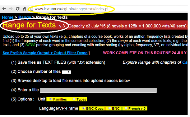 Cobb, T. Range for texts v.3 [computer program]. Accessed 10 Jan 2025 at https://www.lextutor.ca/cgi-bin/range/texts/.(Examples for other Lextutor pages)